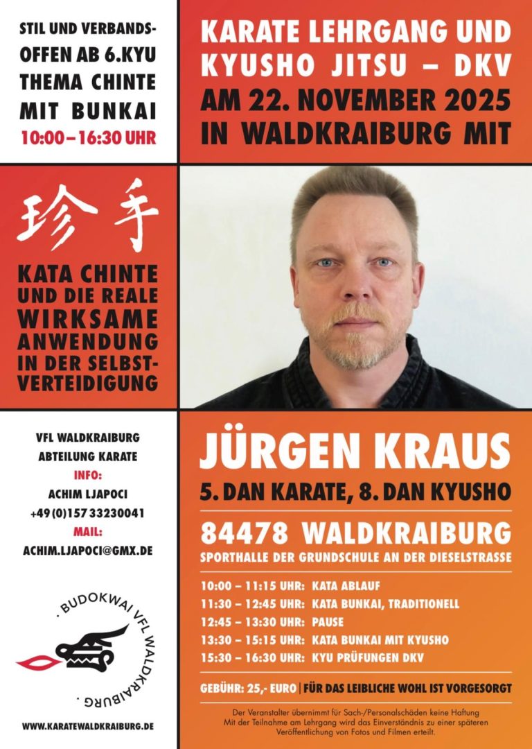 22. November 2025 @ 10:00 - 16:30 Karate und Kyusho-Jitsu Lehrgang in Waldkraiburg mit Jürgen Kraus Budokwai Waldkraiburg Dieselstraße 4 a, Waldkraiburg €25,
